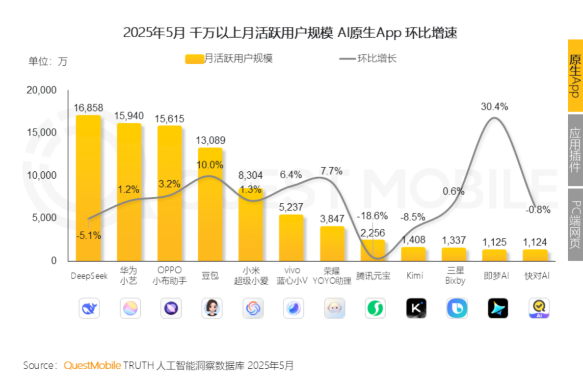 7月2日,吸引更多用户利用,本年5月,据贸易智能数据办事商QuestMobile发布的《2025年AI使用演讲》显示,另一方面,此中DeepSeek和豆包这两大使用的月活跃用户数别离冲破1.68亿和。业内专家认为,